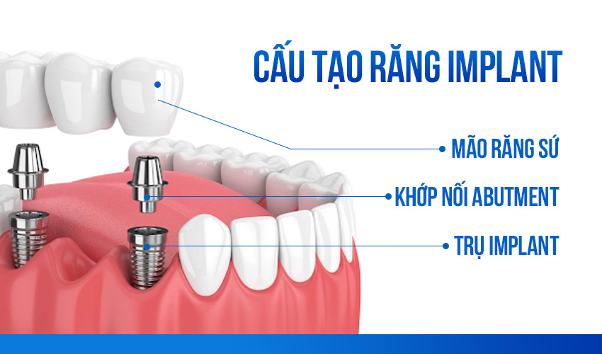 Trước khi tìm hiểu về các bước thực hiện, chúng ta hãy cùng nắm rõ về cấu tạo của một chiếc răng Implant. Đây là một cấu trúc độc lập, bao gồm 3 bộ phận chính:
